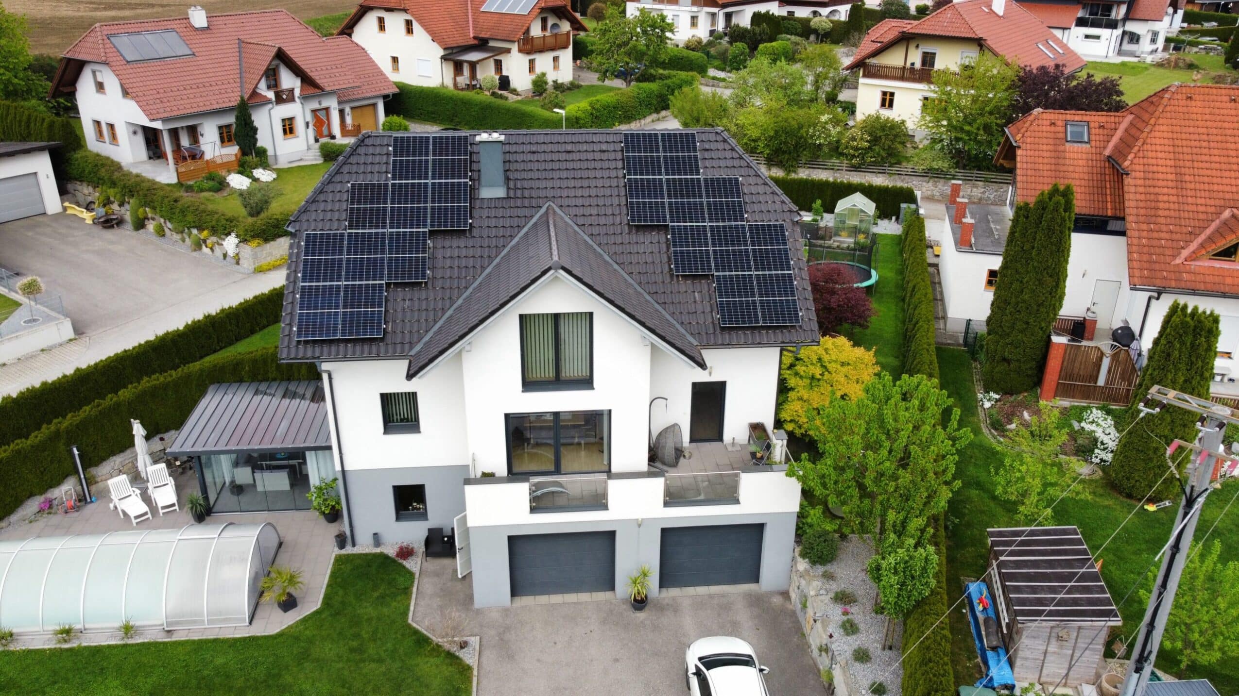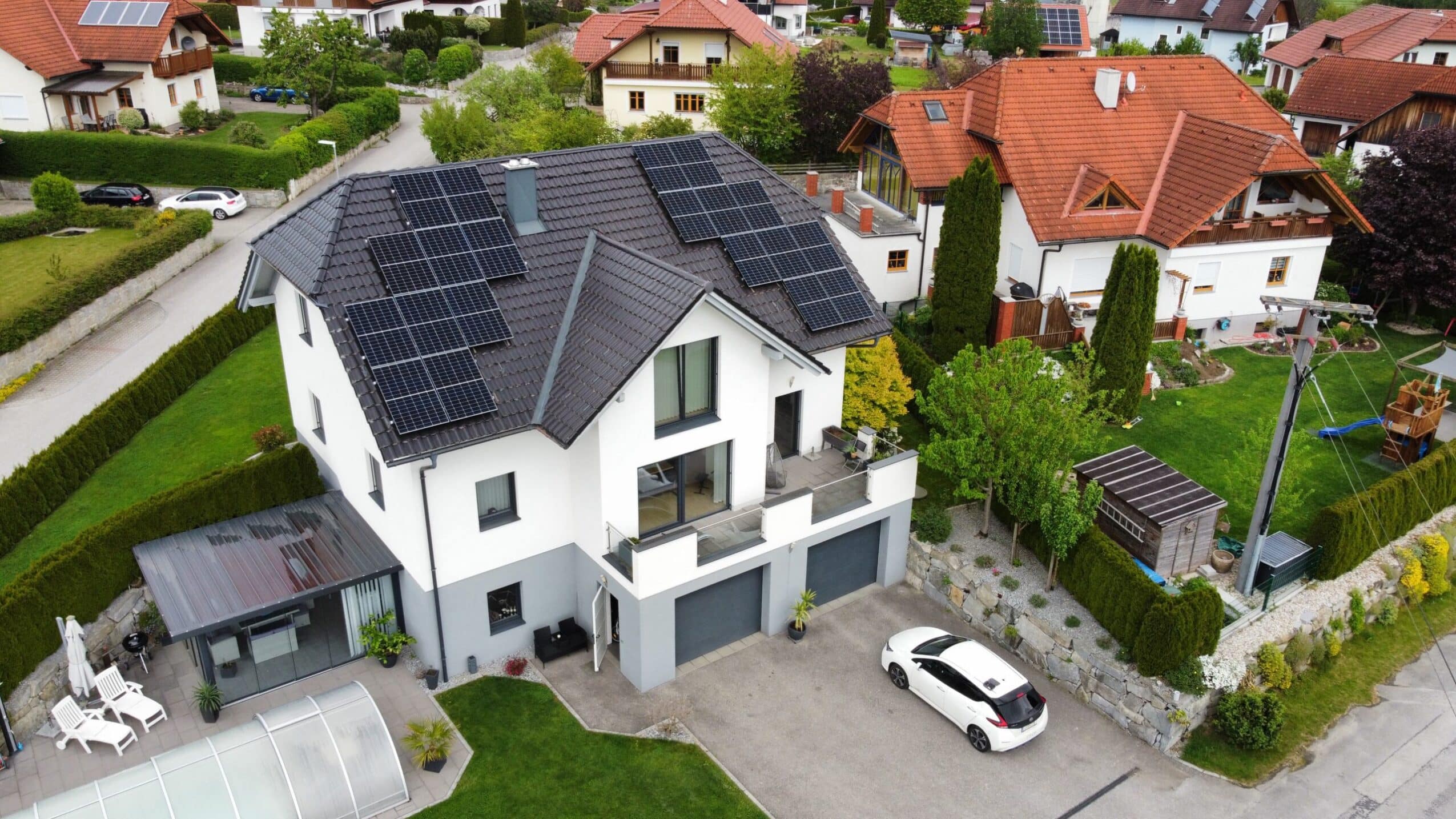 Bei diesem Projekt wurde eine Photovoltaikanlage mit 8,3 kWp Leistung umgesetzt. Die Module wurden dachparallel mit robusten Dachhaken installiert und sorgen für eine optisch ansprechende Integration ins Dachbild. Der erzeugte Strom wird größtenteils direkt im Haushalt genutzt, überschüssige Energie ins öffentliche Netz eingespeist. Eine kompakte und effiziente Lösung für umweltfreundliche Energiegewinnung im Eigenheim.