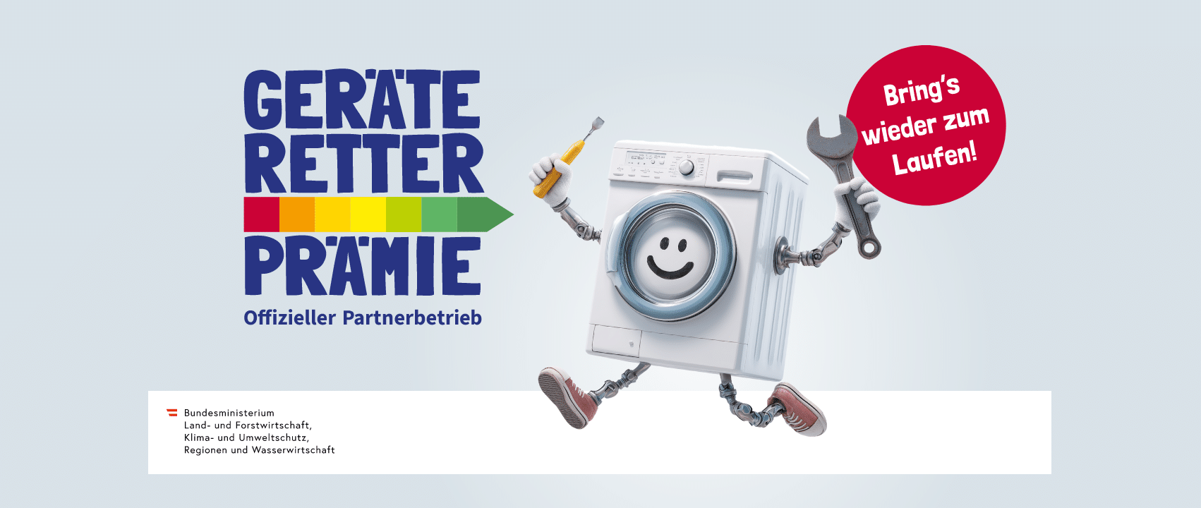 Mit der Geräte-Retter-Prämie sparen Sie 50 % der Reparaturkosten, bis zu 130 € pro Reparatur. Damit schonen Sie nicht nur Ihr Budget, sondern leisten gleichzeitig einen wertvollen Beitrag zum Umwelt- und Klimaschutz.
